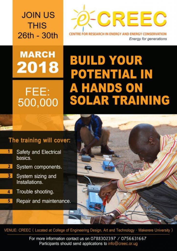 20 CREEC TECHNICIANS ASSESSED BY DIT On 28th March 2019, CREEC experienced her first assessment for solar technicians by the Directorate of Industrial Training under the Ministry of Education. 20 solar technicians
