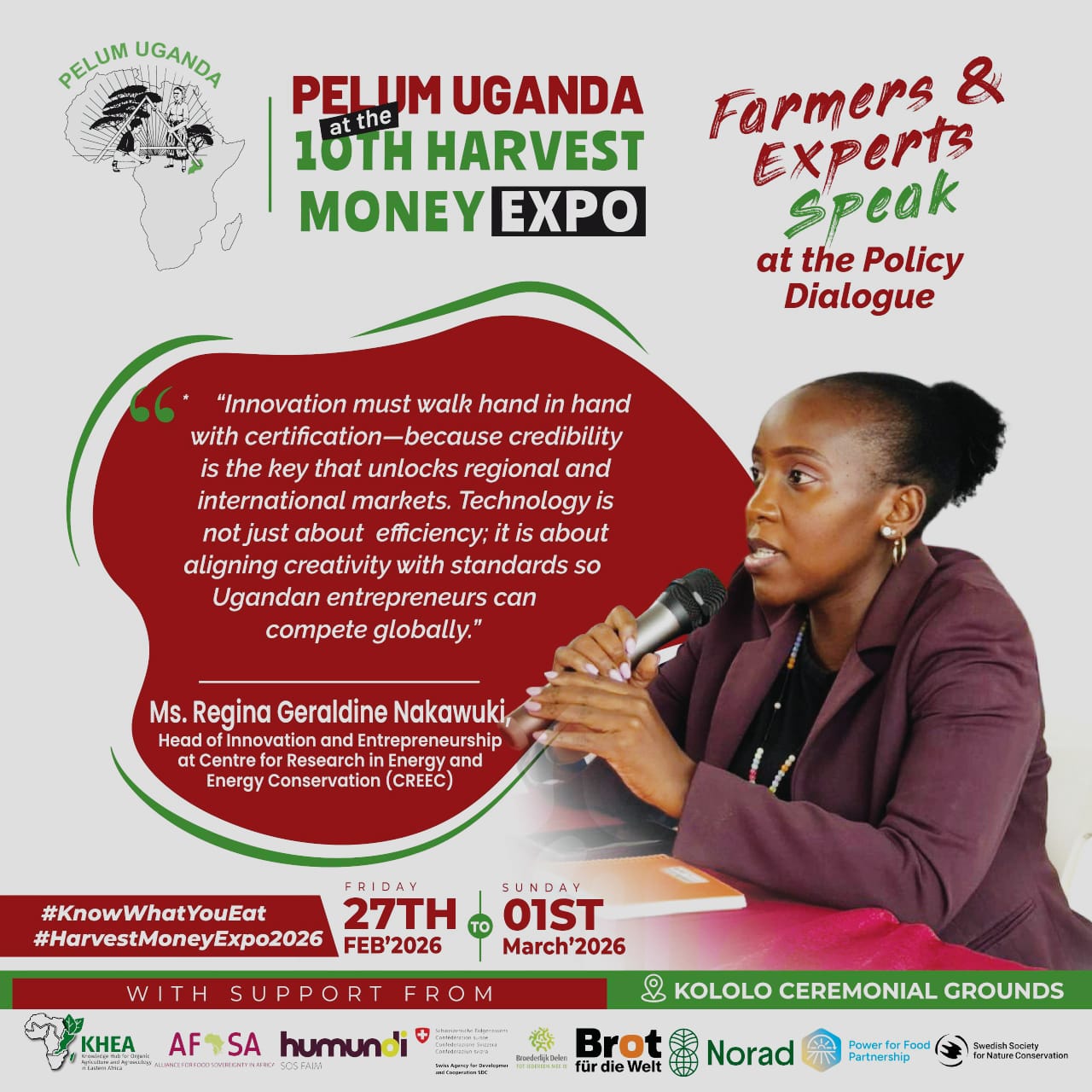 Today at the #HarvestMoneyExpo2026, our Head of Innovation, Regina Nakawuki, delivered a masterclass in policy and systems thinking during the high-level dialogue on Agro-ecology and Market Access.